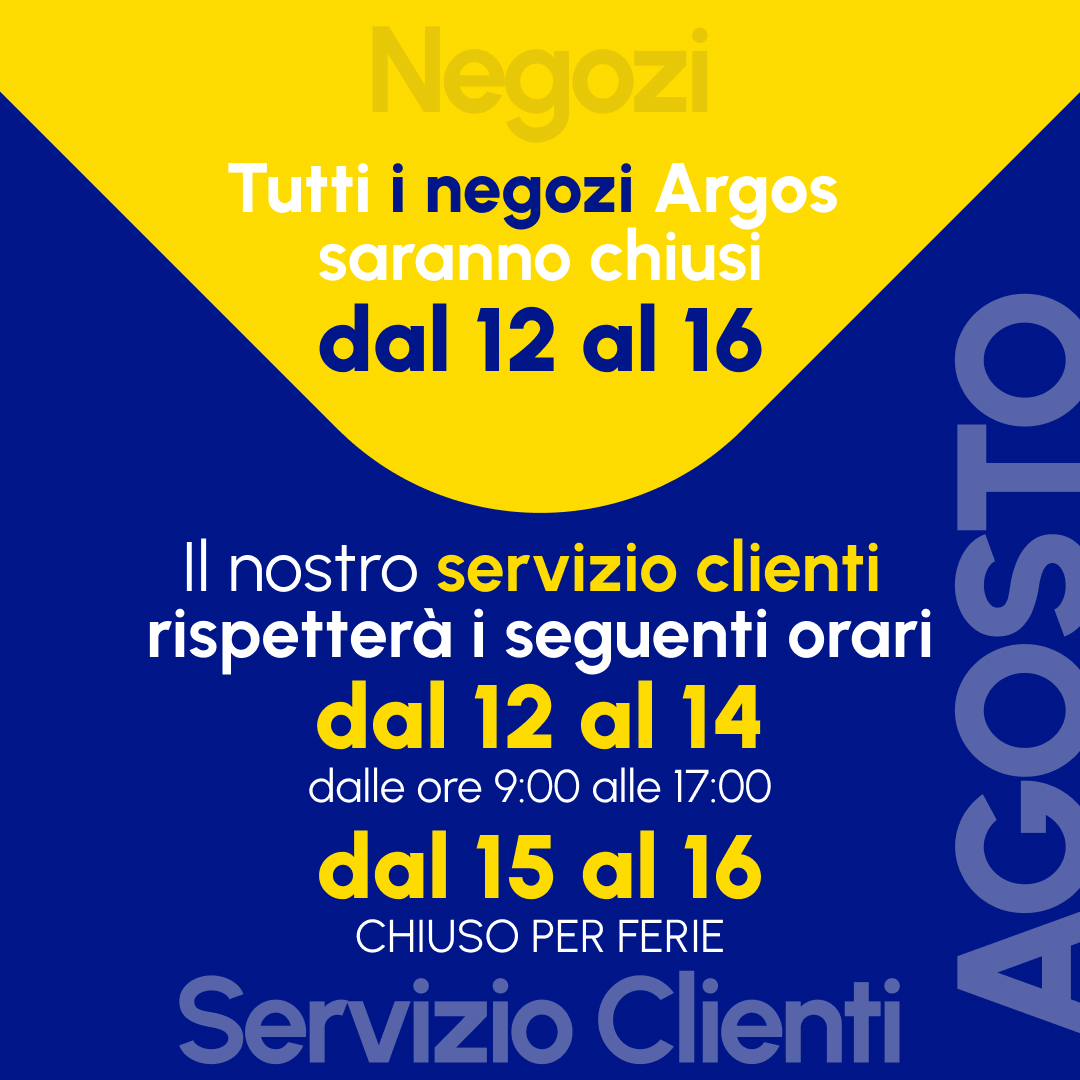 Il servizio clienti Argos è reperibile tramite la sezione supporto o al numero verde 800-178997 (da rete fissa) e 049-7896840 (da mobile), da lunedì a venerdì dalle 9.00 alle 18.00.